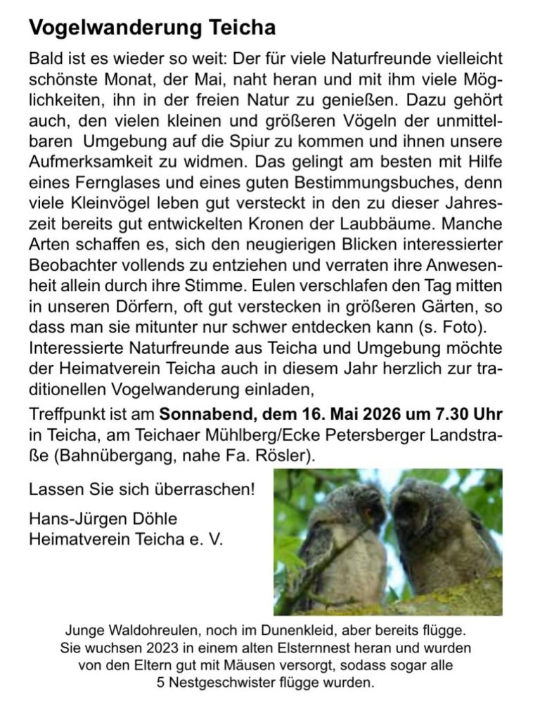 Ein bedeutendes neues Projekt des Vereins ist der digitale Dorfrundgang, der Besuchern und Einheimischen einen interaktiven Einblick in die Geschichte und Besonderheiten von Teicha bietet. Zudem arbeitet der Verein daran, eine Dorfchronik zu erstellen, die die historischen Ereignisse und Entwicklungen des Ortes dokumentieren soll.